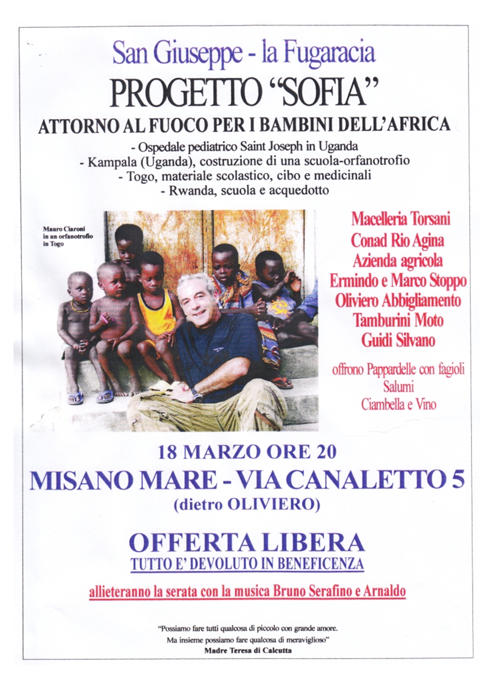 Attorno al fuoco per i bambini dell’Africa. L’appuntamento è a Misano Mare Via Canaletto, 5 ore 20.00 Per aiutare bambini in Uganda, Togo, Rwanda.