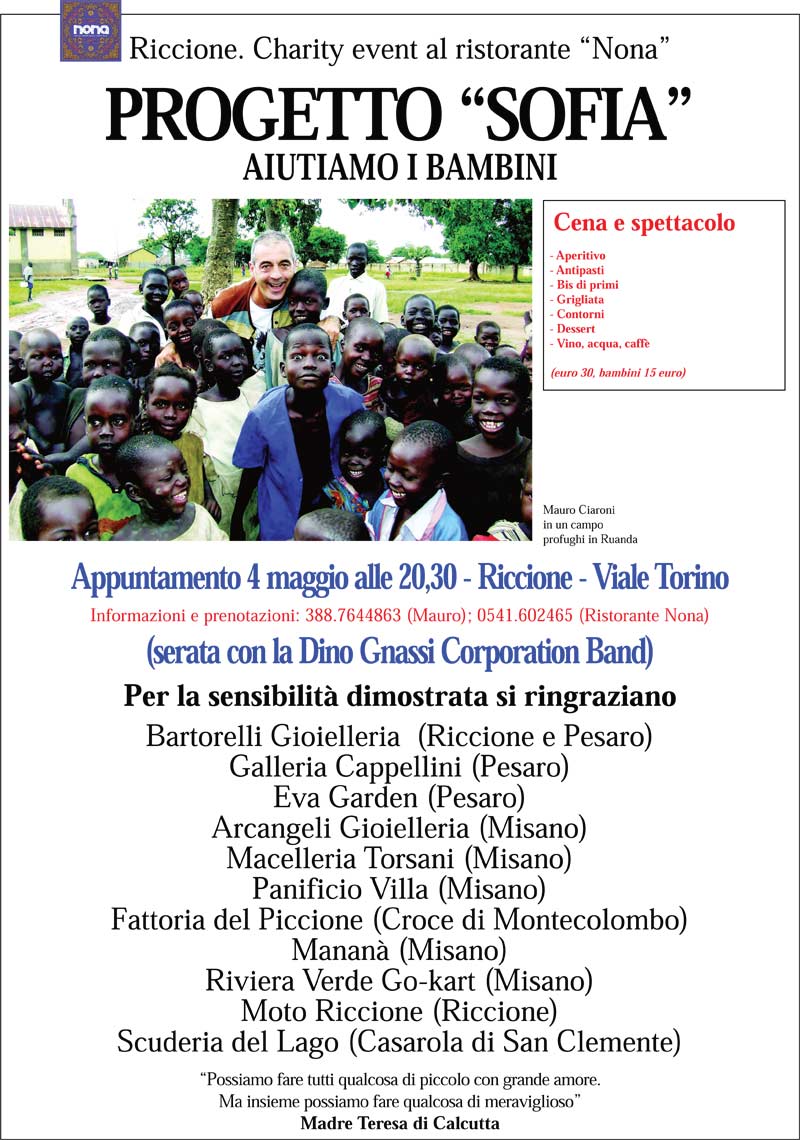 Una serata speciale per sostenere un progetto straordinario, quello ideato da Mauro Ciaroni 13 anni fa, grazie alla ‘complicità’ di sua figlia Sofia che un giorno, dopo aver visto delle diapositive al ritorno da un viaggio di suo padre in Africa, ha espresso il desiderio di aiutare i bambini che vivono in quei difficili contesti. “Progetto Sofia è dedicato ai miei figli e a mia moglie – racconta Mauro Ciaroni – è grazie al loro sostegno infatti che trovo la forza per continuare questa esperienza meravigliosa”. Al loro grande altruismo si aggiunge oggi un piccolo contributo da parte di NONA, e del suo proprietario Gian Maria Emendatori, che mercoledì 4 maggio metterà il locale a disposizione del progetto per una raccolta fondi destinata a sostenere le tante iniziative messe in campo per l’anno 2016. Insieme al NONA ci saranno anche: Torsani Carne, Fattoria del Piccione, Panificio Villa, Dino Gnassi Band, Tenuta Mara e Birra Viola. Tutti insieme per contribuire al successo della serata e del progetto. PROGETTO SOFIA è un progetto interamente dedicato ai bambini bisognosi di qualsiasi parte del mondo. Annovera diverse Missioni, tutte dirette ad aiutare orfani di guerra e di epidemie, bambini soldato, bambini abbandonati nelle strade, cardiopatici, bimbi con problemi psichici e fisici. Le strutture a cui in questi anni sono destinati gli aiuti economici sono orfanotrofi, centri malattie mentali, villaggi accoglienza, campi profughi, scuole… Fino ad ora il progetto ha raccolto la somma di 308.418,00 euro, interamente utilizzata per aiutare migliaia di bambini senza dover passare per i complicati ingranaggi delle burocrazie statali e locali. In particolare sono stati acquistati i seguenti beni di prima necessità direttamente sul posto, per evitare lo scoglio delle dogane: medicinali, alimenti, vestiario, materiale scolastico e giocattoli. E’ stato possibile realizzare la ristrutturazione di Orfanotrofi, Scuole, Dormitori, Mense, Acquedotti, Sale Parto e Accoglienza Neonati. In alcuni casi è stato addirittura possibile costruire ex novo laboratori per l’avviamento al mondo del lavoro e per agevolare l’inserimento nella società. Destinatari dei fondi raccolti nel 2016 saranno: Casa del Bambino di Ebil (Iraq), Casa del Bambino Hogar NiÑo Dios (Betlemme), Orfanotrofio S. Jude di Gulu (Uganda), Baby Hospital (Betlemme), Centro accoglienza bambini terremotati (Kathmandu), Orfanotrofio ‘Ragazzi nella tempesta’ (Sudan).