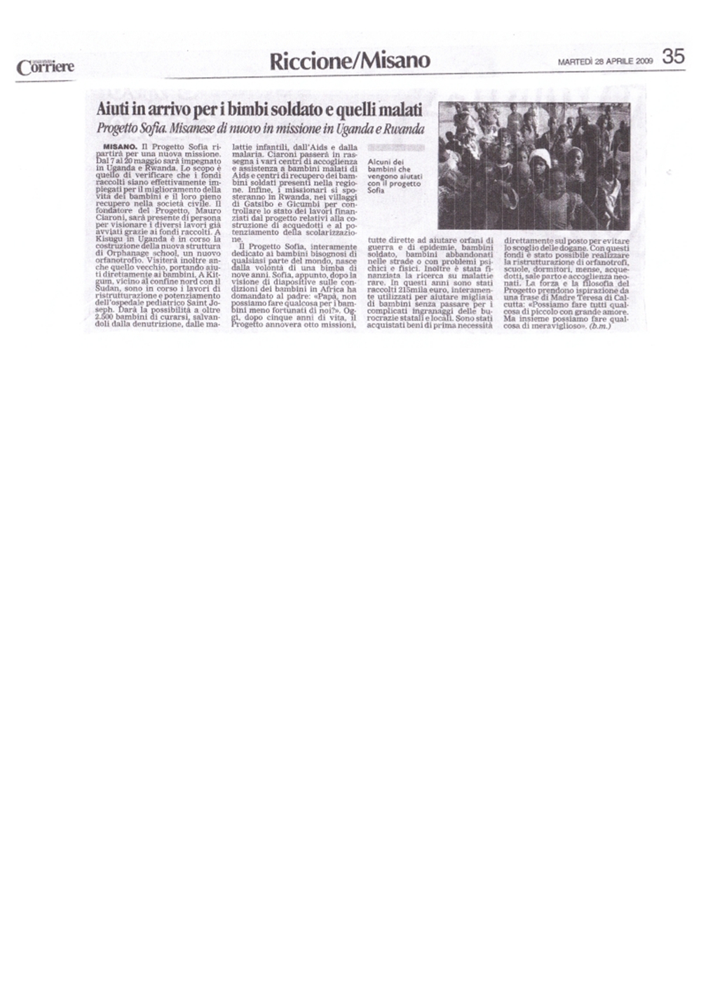 Rassegne Stampa Stampa 28 aprile 2009 28 Aprile 2009 admin Aiuti in arrivo per bimbi soldato e quelli malati Articolo apparso sul quotidiano “Corriere”, 28 aprile 2009