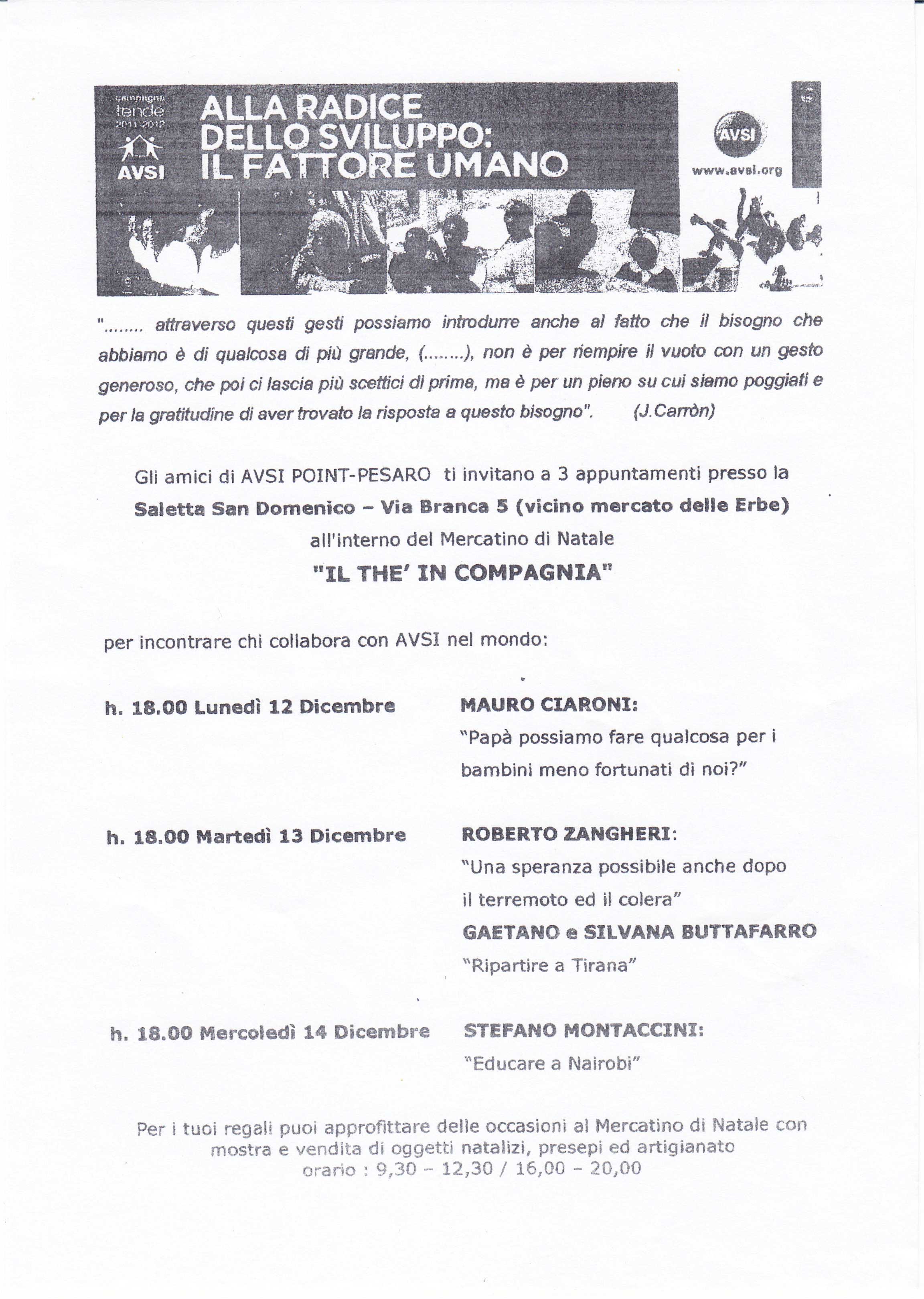 Eventi di Beneficenza Evento 12 dicembre 2011 12 Dicembre 2011 admin Incontriamo chi collabora con AVSI nel mondo Saletta San Domenico – Via Branca 5 Pesaro